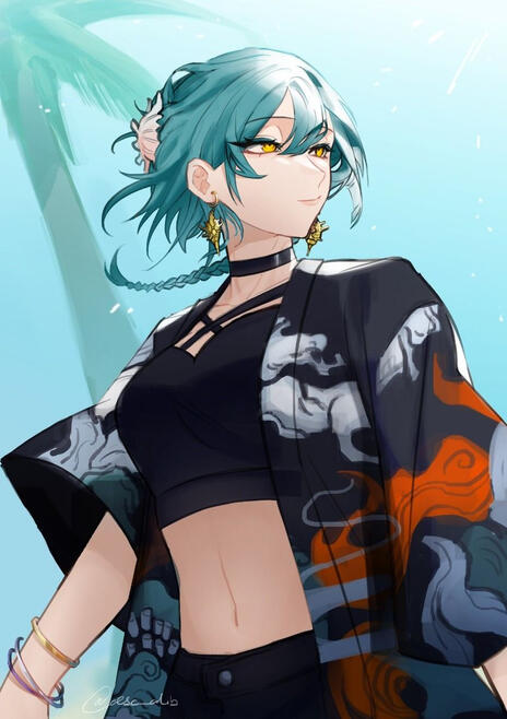she has pretty damn long blue-teal hair, and yellow sharp feline eyes. she has fairly sharp teeth along with the twins, and she hs decently light skin. she naturally has these fin-like ears, and, whenever she touches water, like the twins, she turns into a mermaid. little dips of water will only expose blue-teal scales across her body depending on where the water splashed on her. she's fairly skinny, and pretty. (more like the twins just love her sm, always complimenting)